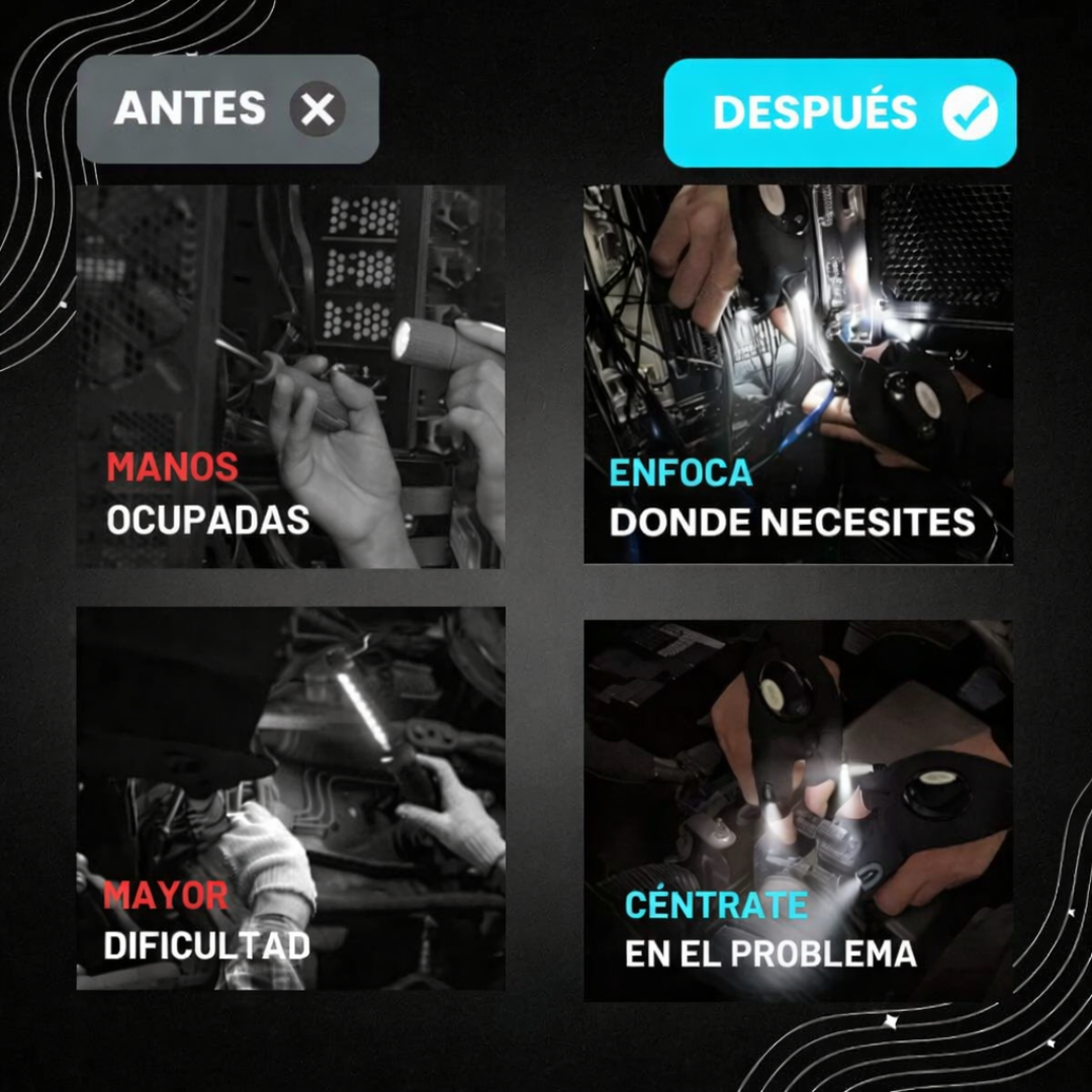 “Trabajo arreglando carros y estos guantes me han servido bastante, sobre todo cuando me toca trabajar tarde. La luz apunta justo donde estas trabajando y eso ayuda mucho. Son comodos y no estorban para nada. Al principio pensé que iban a ser incomodos, pero nada que ver. Buen producto.”Maria -